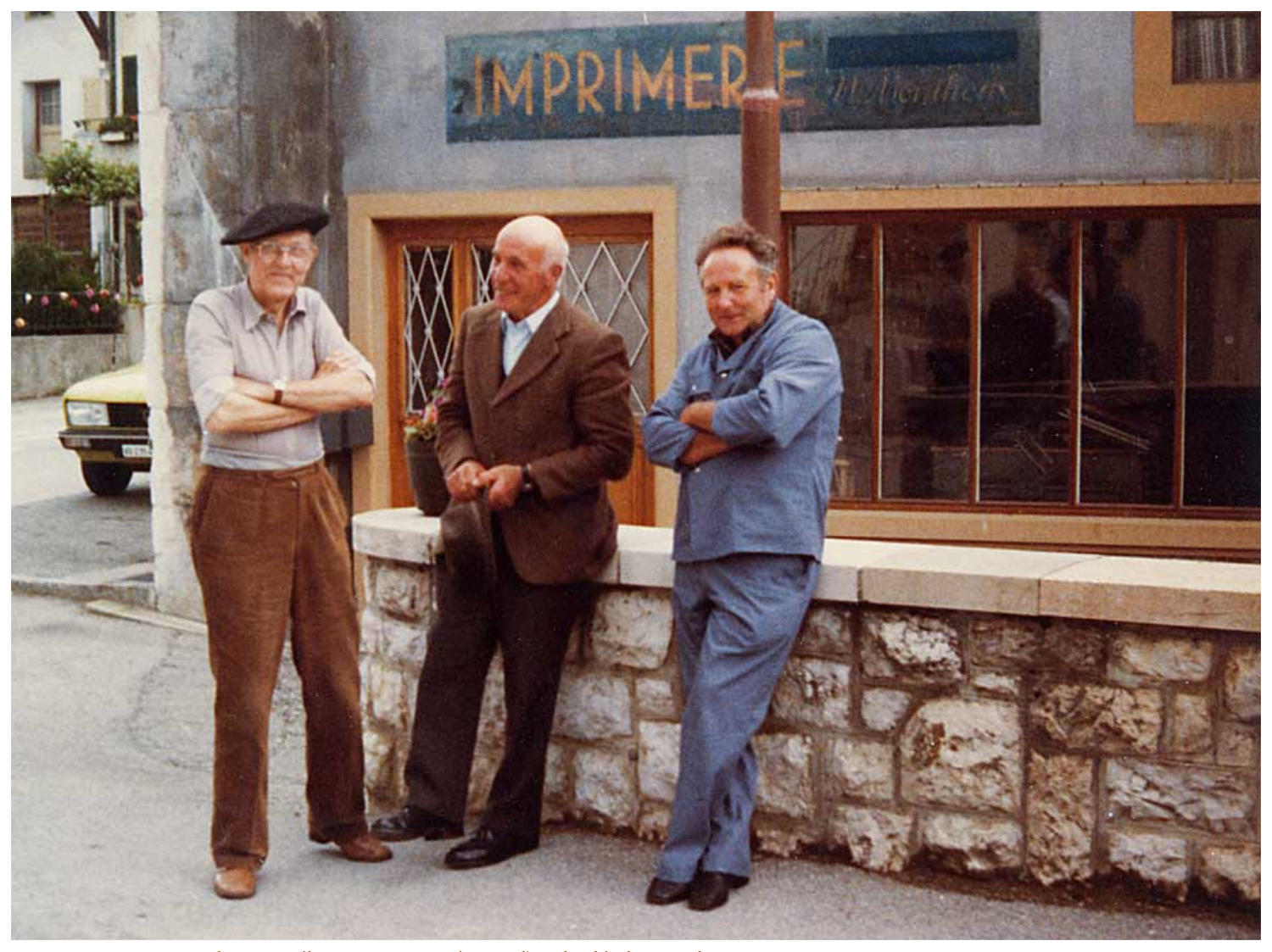 Willy Monthoux devant son imprimerie avec Henri Bugnoux
