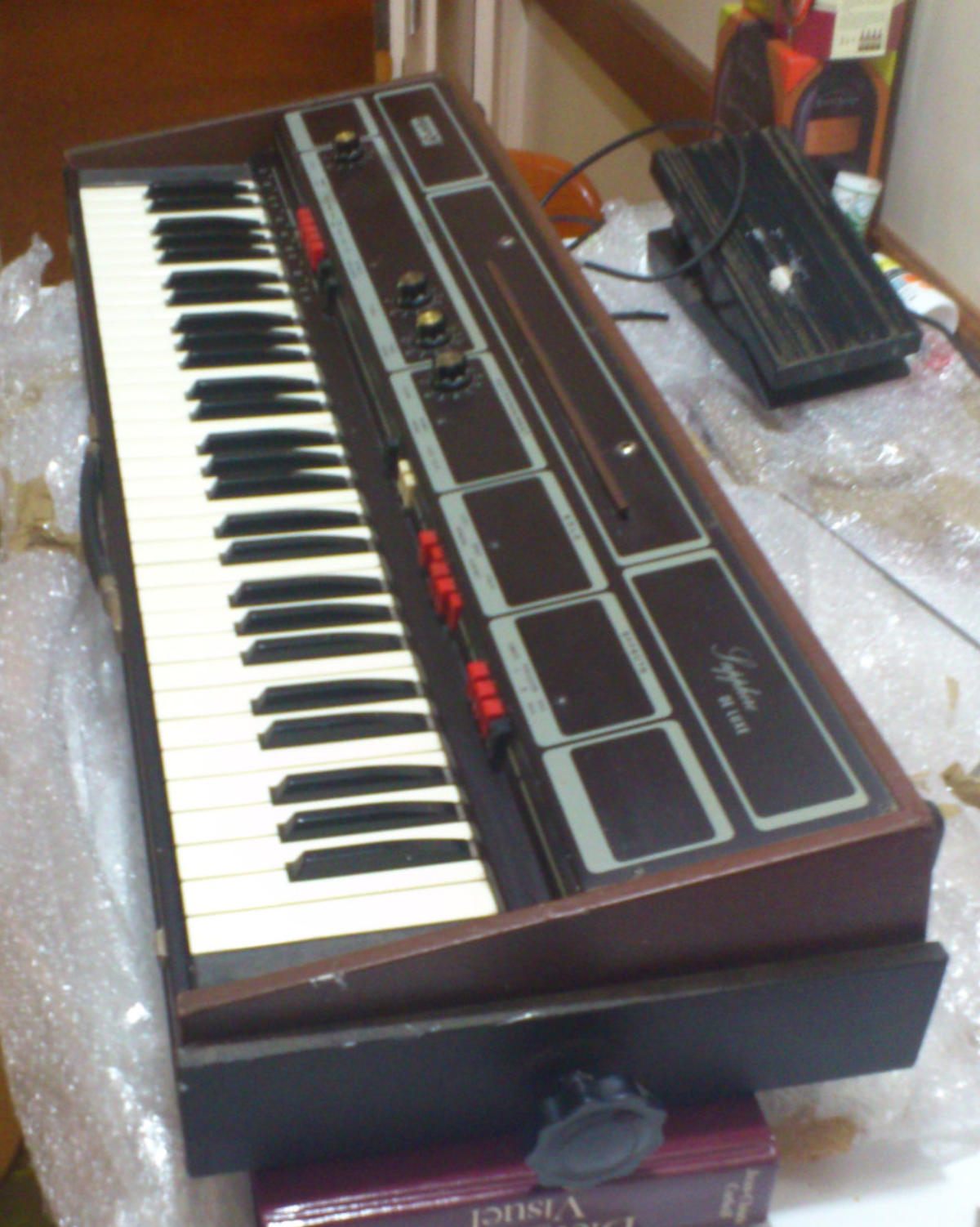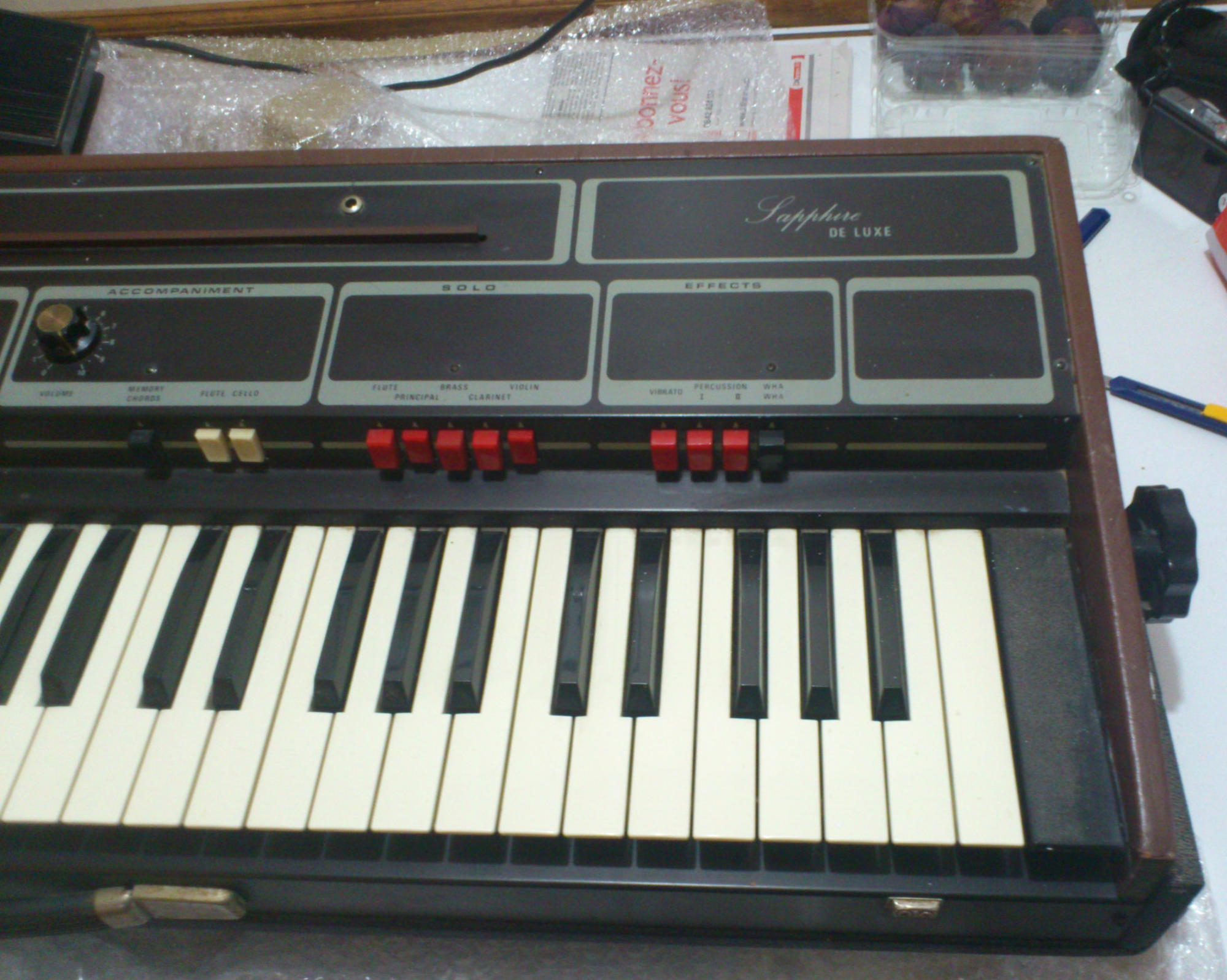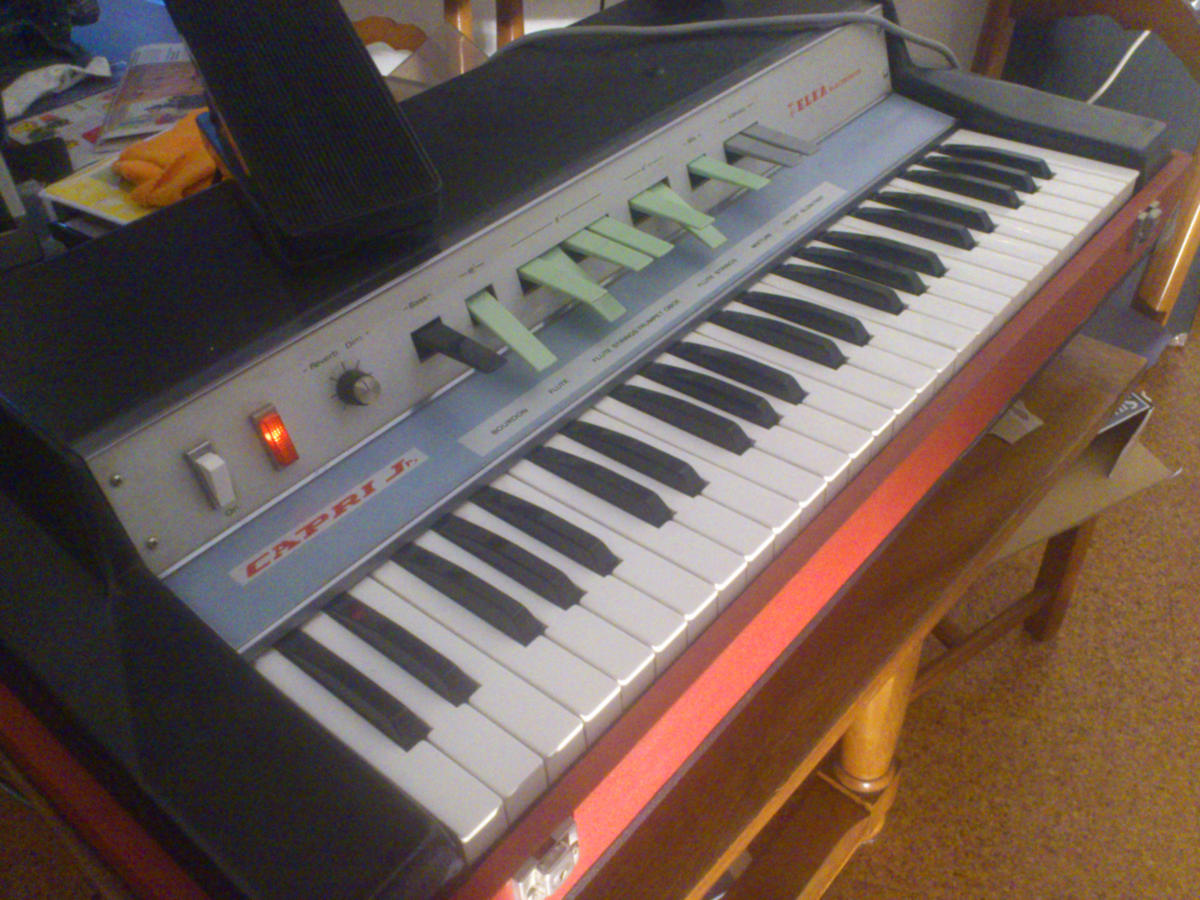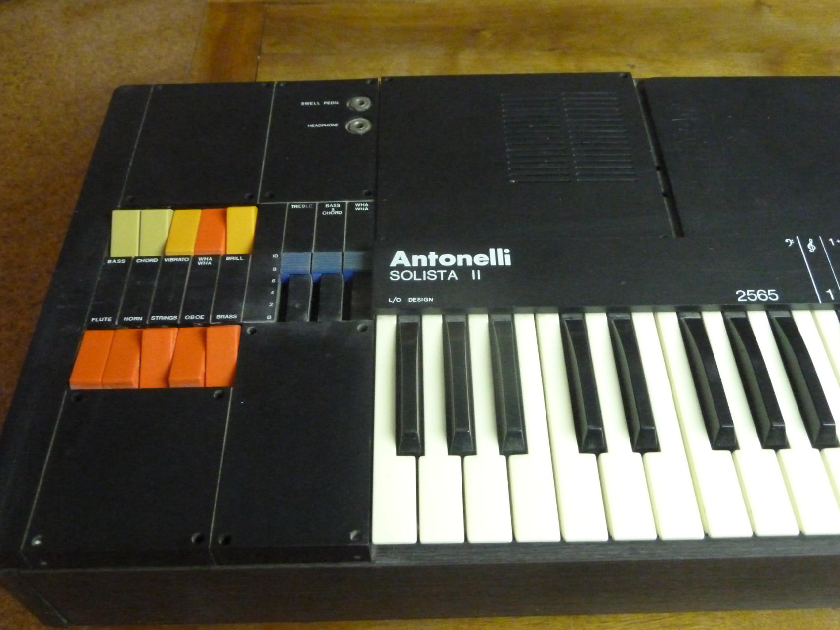 Un Antonelli Solista II 2565, un orgue relooké par un certain L/O comme on peut le lire juste en dessus de la première note du clavier. Il s’agit de Lslifj sldfjdlfkj, le tout grand designer Italien (je mettrais le nom quand je l’aurais retrouvé...)