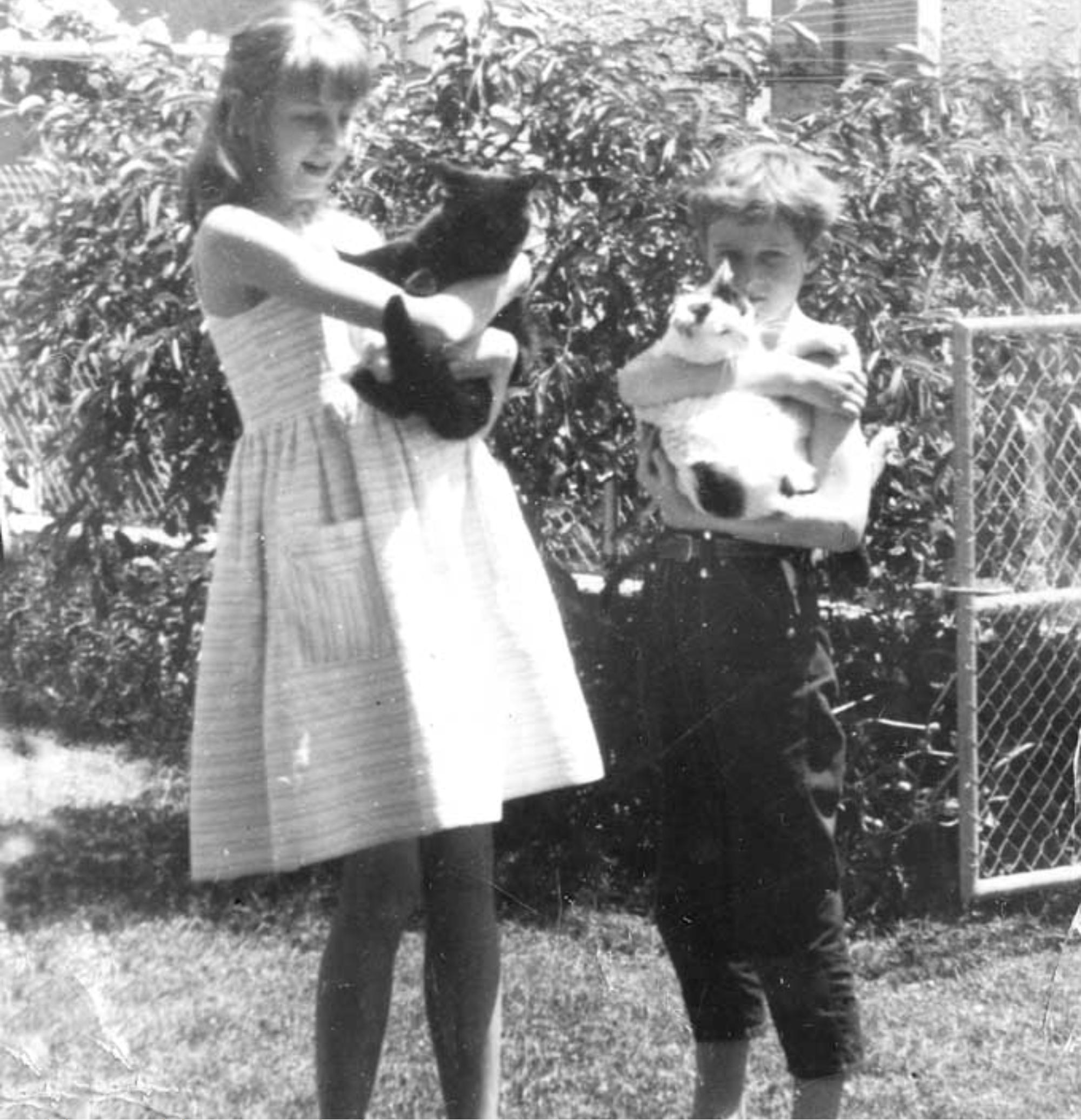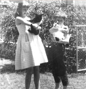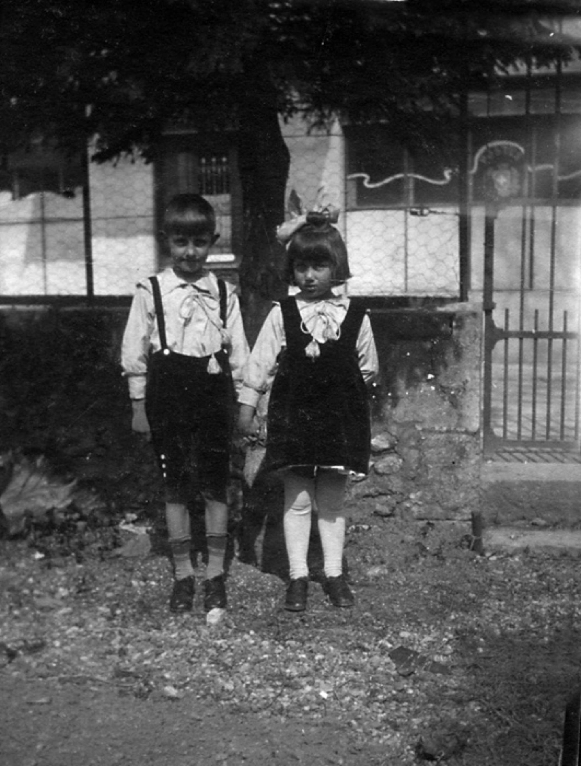 Ma soeur et moi devant le pavillon du jardin.